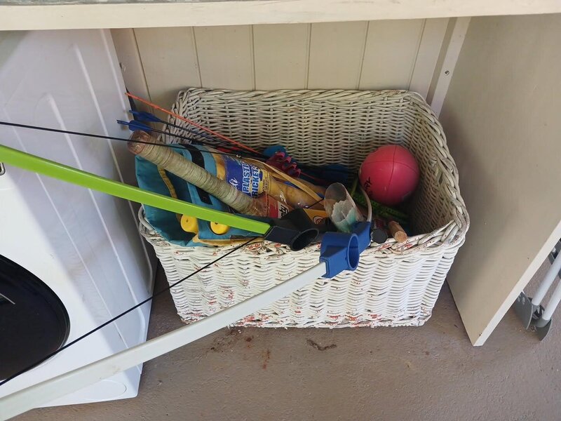 Laundry facilities including a washing machine, outdoor clothesline, and drying airers for convenience